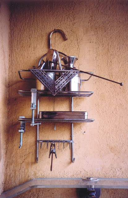 En la tranquila altura de esta esquina sombreada, se ha instalado una percha de baño, con estantes de rejilla, sobre la que se han acoplado una pareja de aceiteras metálicas, dos cajitas niqueladas de jeringuillas de El Rastro, y un par de tornillos de carpintero, colgados de la madrepercha.